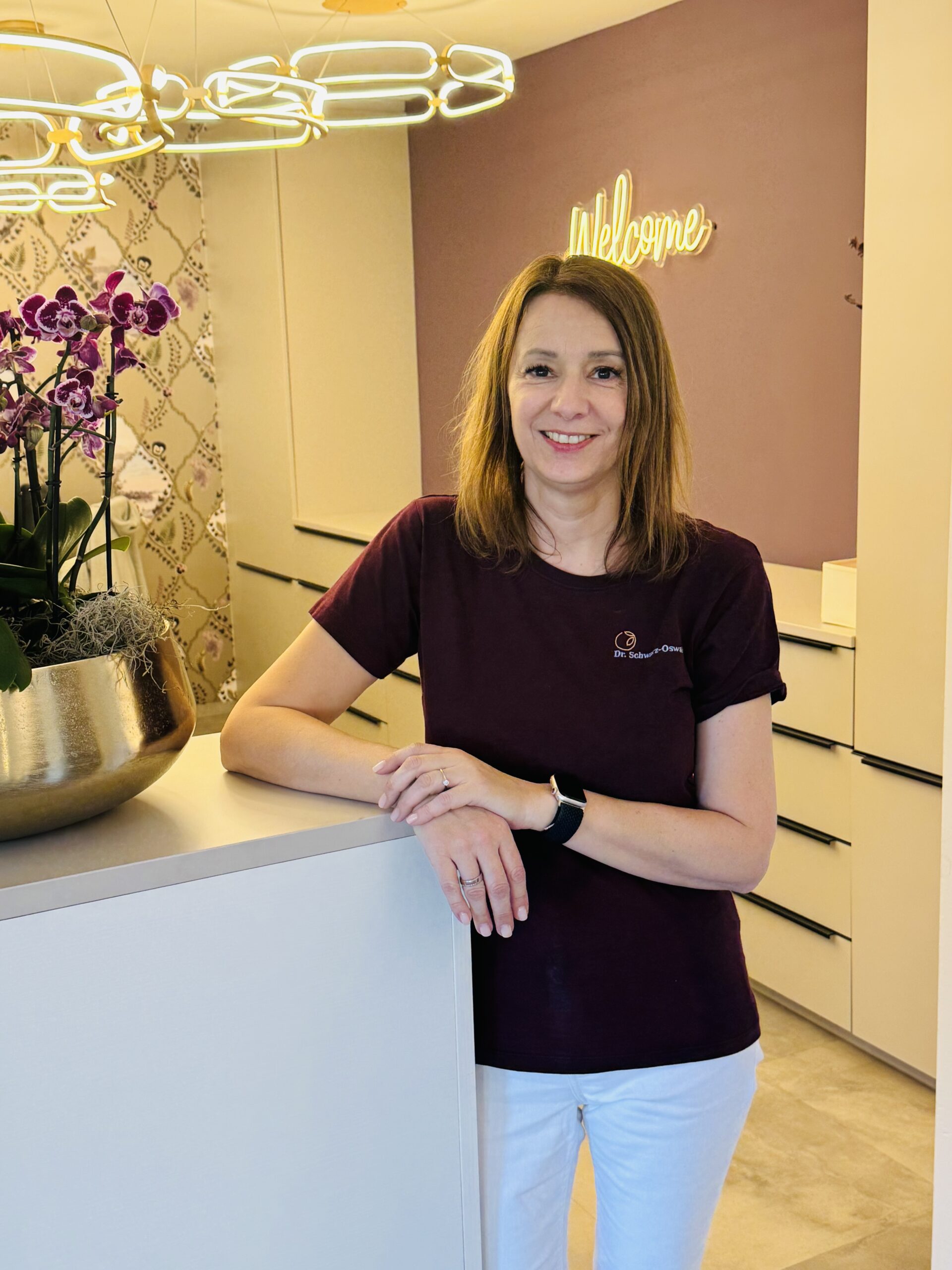 Dr. Sabine Schwarz-Oswald im freundlichen Wartebereich der Praxis für Brustgesundheit.